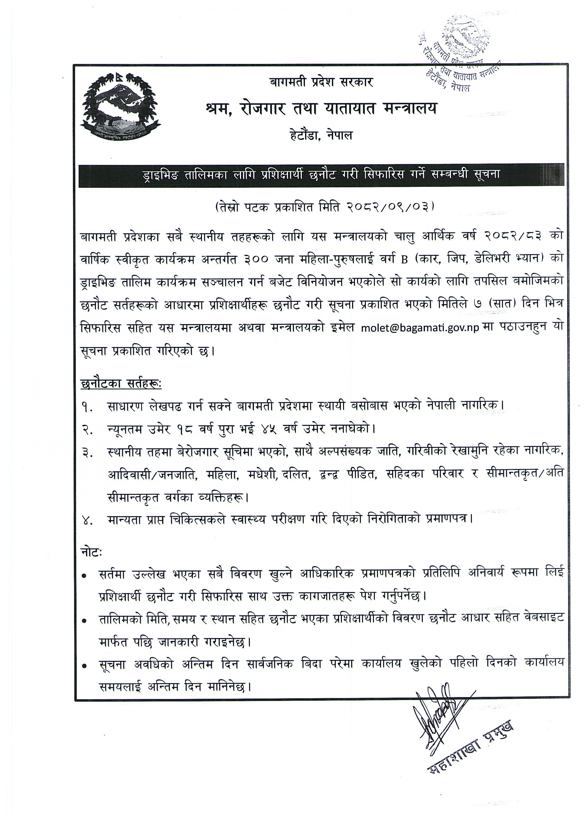 ड्राइभिङ तालिमका लागि प्रशिक्षार्थी छनौट सम्बन्धी सूचना