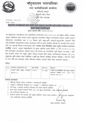 चाँगुनारायण नगरपालिकाको प्रदेश सरकार सशर्त अनुदानमा हस्तान्तरित कृषि कार्यक्रम संचालनका लागी प्रस्ताव आह्वान सम्बन्धी सूचना