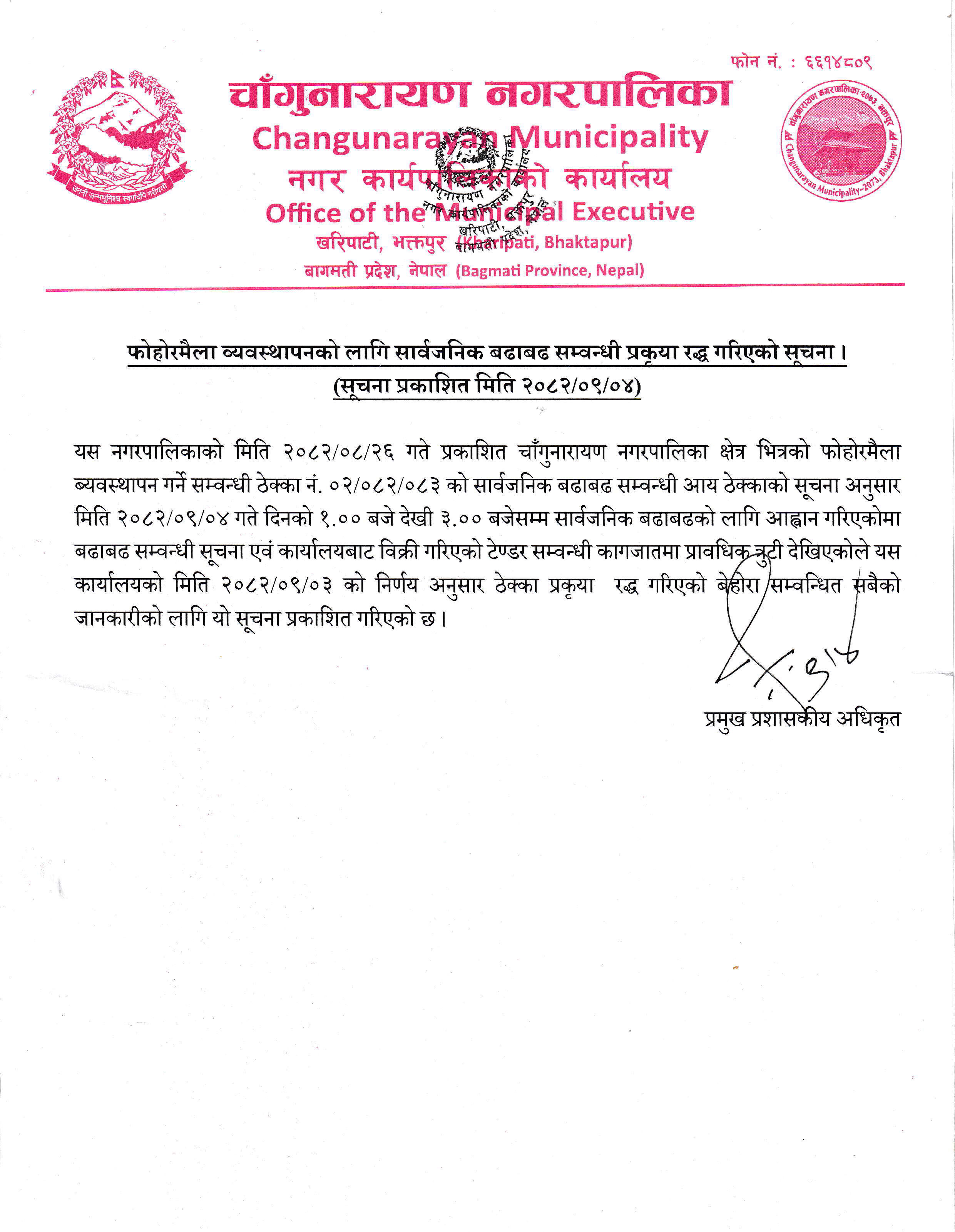 फोहोरमैला व्यवस्थापनको लागि सार्वजनिक बढाबढ सम्बन्धि प्रकृया रद्ध गरिएको सूचना