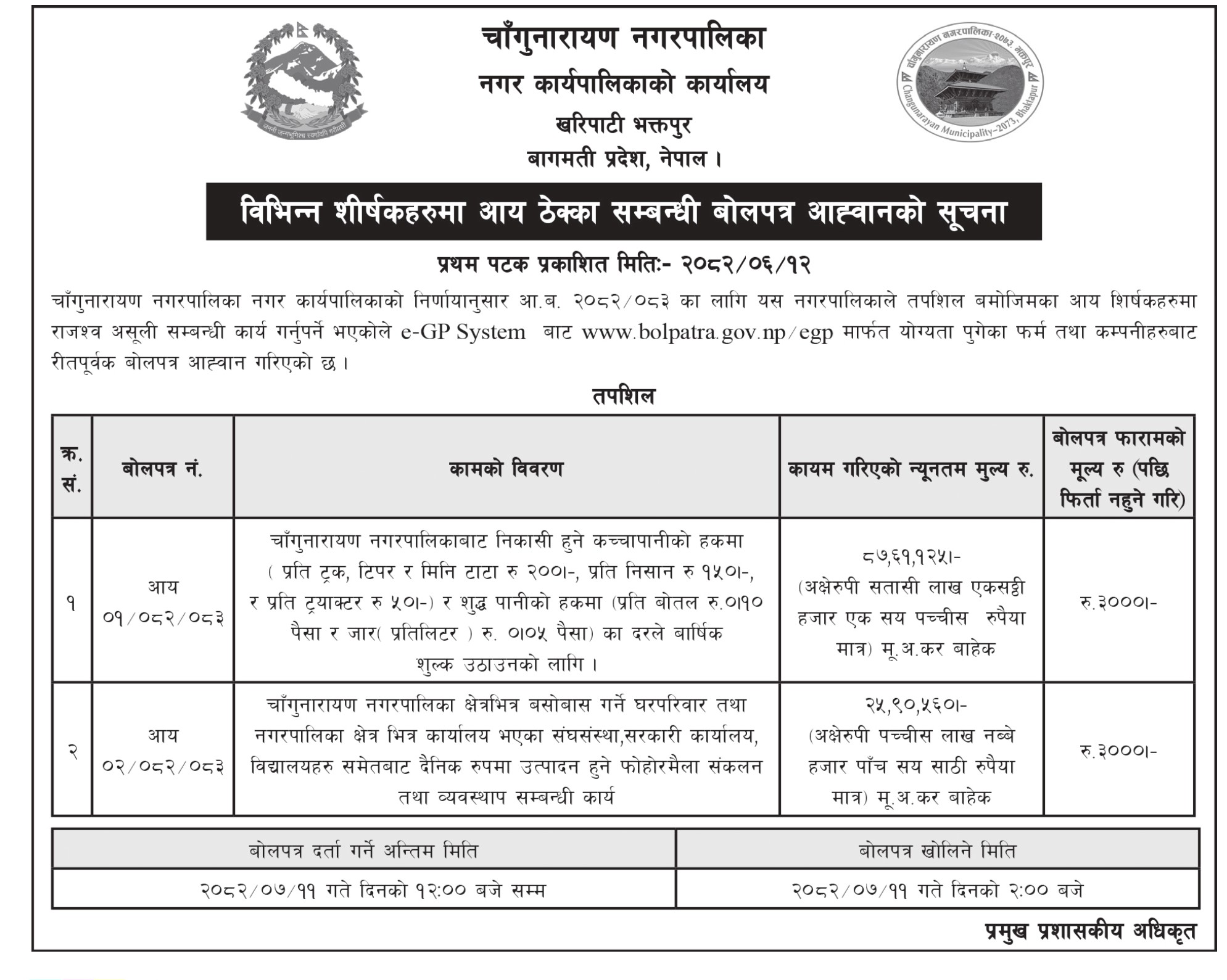 विभन्न शिर्षकहरुमा आय ठेक्का सम्बन्धि बोलपत्र आहवानको सूचना